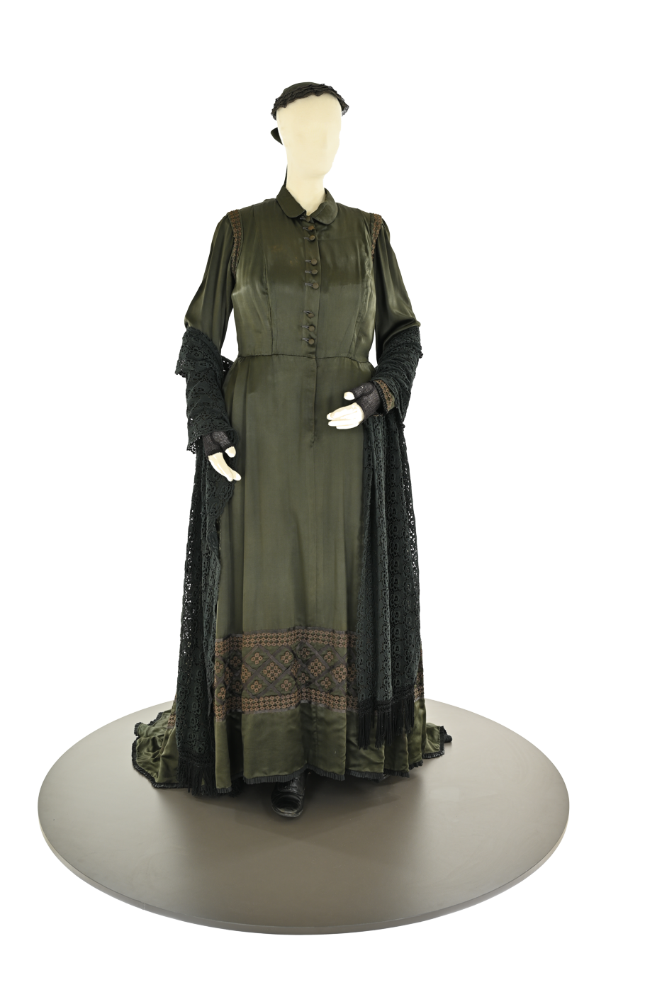 Μακρύ φόρεμα με ουρά, κλειστό ντεκολτέ με στρογυλλό γιακά και μακριά μανίκια
