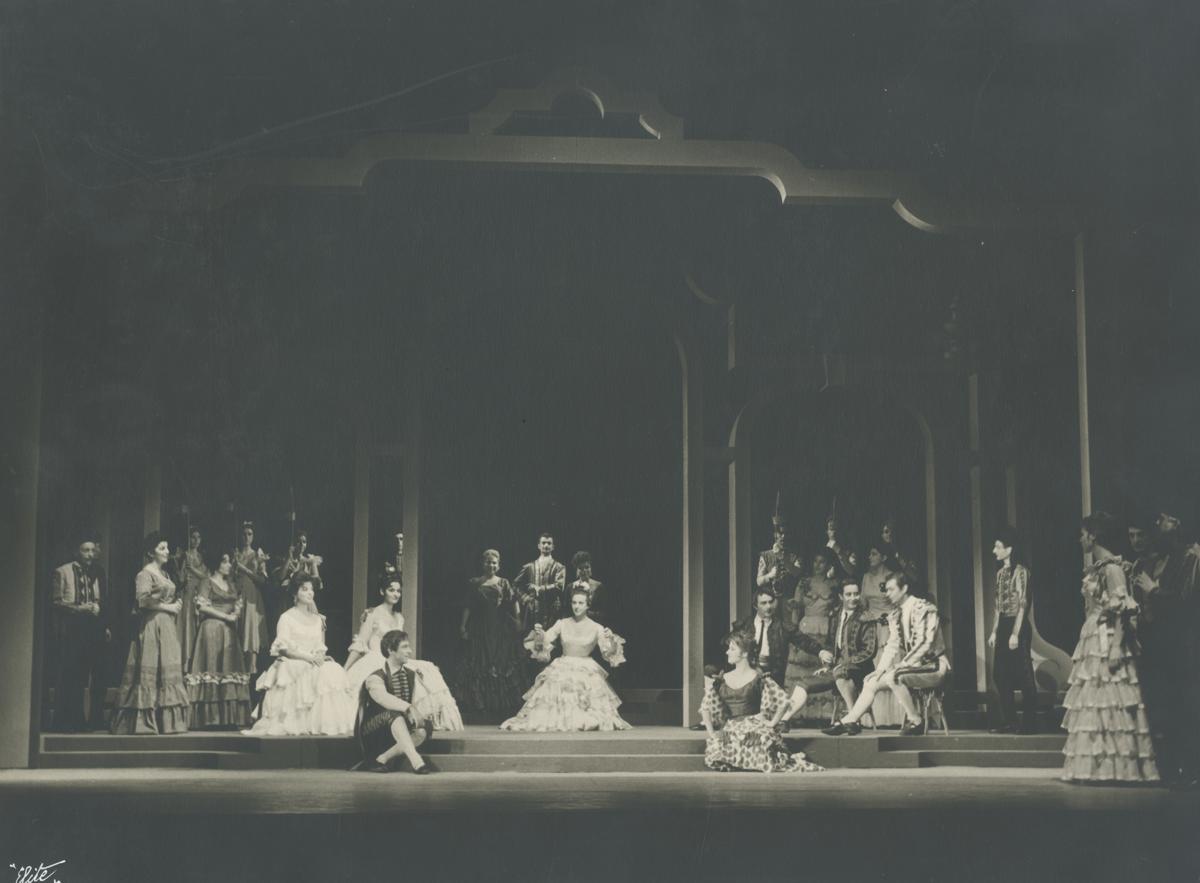 On the left, in front: Anna Kyriakou (Kynthia), Alekos Deligiannis (Don Louis). At the center: Mairi Aroni (Dona Diana), Nikos Tzogias (Don Cesar). In front: Evaggelos Protopappas (Perin), Kiki Reppa (Floretta). On the right: Nikos Kazis (Don Gaston),