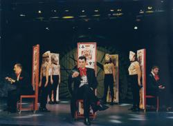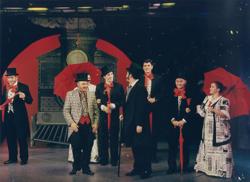 On the left: Michalis Koukoulommatis (μ.τ.ρ.), Konstantinos Ath. Giannakopoulos (American officer), Kalliopi Kotzailia (Zidu), turned back: Christos Pappas (Passepartout). At the center: Chrysanthi Veloudaki (Auda), Nikos Sideris (Phileas Fogg).