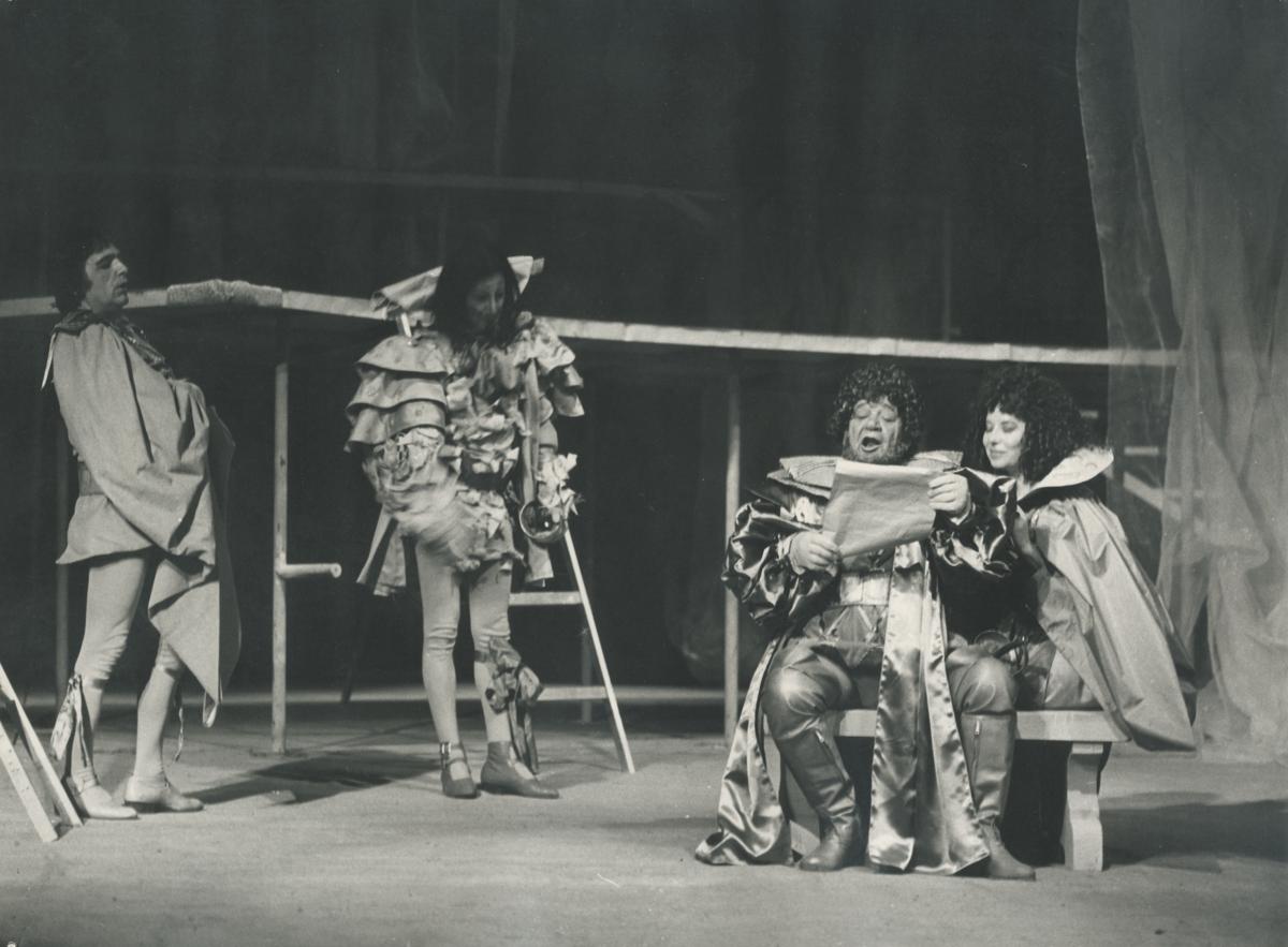 Anna Kyriakou (Μαρία), Pantelis Zervos (Mr. Toby ), Zoras Tsapelis (Μαλβόλιο), Giorgos Tsitsopoulos (Feste ). Up: Δημήτρης Τσούτης (Mr. Andrew).