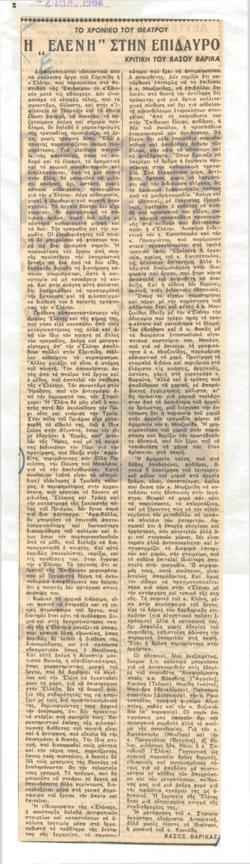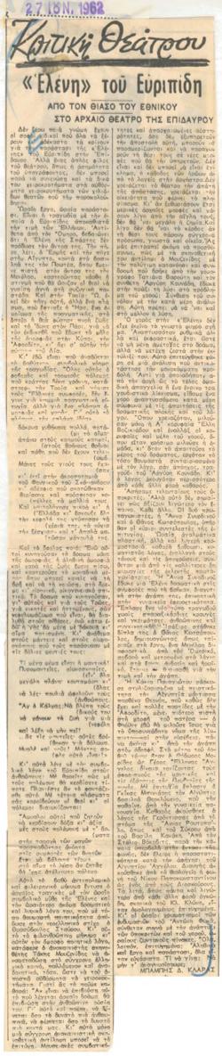 The "Times" of London about the Festival. The most interesting aspect of the Athens Festival. The performances of ancient drama from the National Theatre. Reviews of Euripides' "The Bacchae" and "Helen".