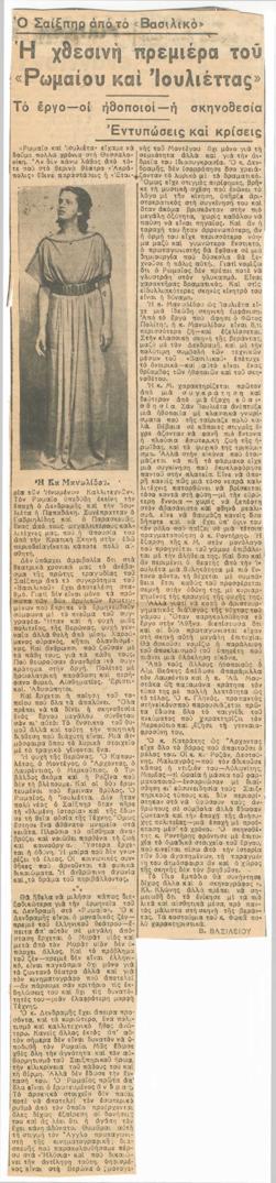 Vaso Manolidou (Juliet), Nikos Paraskevas (Καπουλέτος), Athanasia Moustaka (Παραμάνα), Sapfo Alkaiou (Capulet's wife).