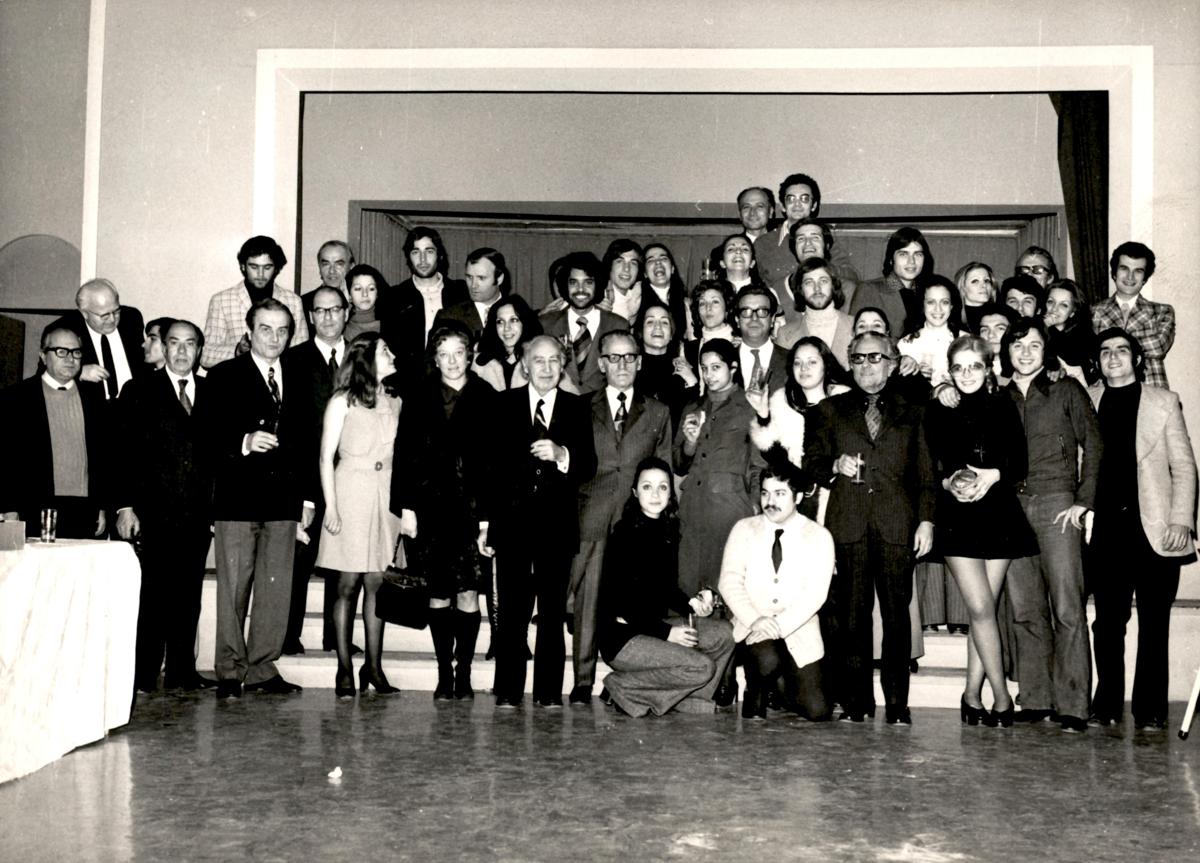 Στο κέντρο μπροστά διακρίνονται μεταξύ άλλων: Έλεν Τσουκαλά, Βασίλειος Παξινός, Στέλιος Βόκοβιτς, πίσω: Βασίλης Φράγκος, καθιστός: Χρήστος Βαλαβανίδης. Αριστερά: Στέφανος Βασιλειάδης, Αλ. Θωμόπουλος. Δεξιά: Τάσος Χαλκιάς, Γιώργος πετρόχειλος, Πένυ Παπουτσή. Πίσω: Στέλιος Καλογερόπουλος, Θάνος Καληώρας, Λήδα Τασοπούλου.