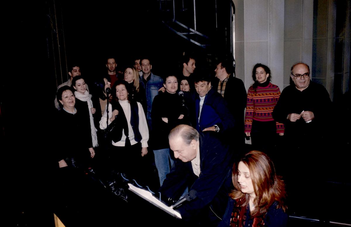 Στιγμιότυπο από την εκδήλωση στο θέατρο Ρεξ. Διακρίνονται μεταξύ άλλων μπροστά ο Γιώργος Θεοδοσιάδης και η Μελίνα Παιονίδου, και πίσω οι Ολυμπία Κυριακάκη-Λουκίσσα, Χρήστος Σπανός, Μαρία Δημητριάδου, Μαριάνθη Σοντάκη, Τάνια Τρύπη, ο Καλλιτεχνικός Διευθυντής Νίκος Κούρκουλος, Τζίνη Παπαδοπούλου, Κώστας Τσιάνος.