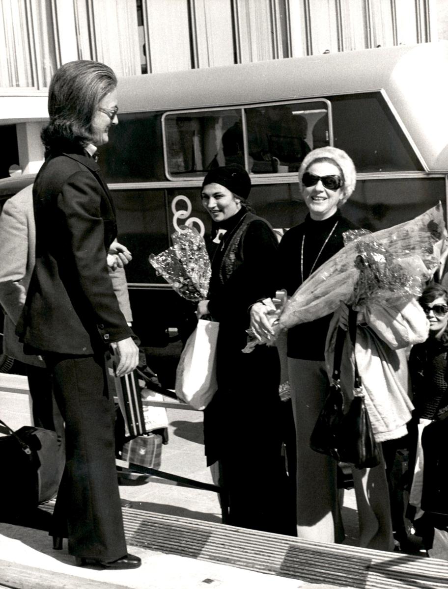 Υποδοχή του θιάσου στο αεροδρόμιο της Αθήνας. Ελένη Ρήγα, Μαίρη Αρώνη.