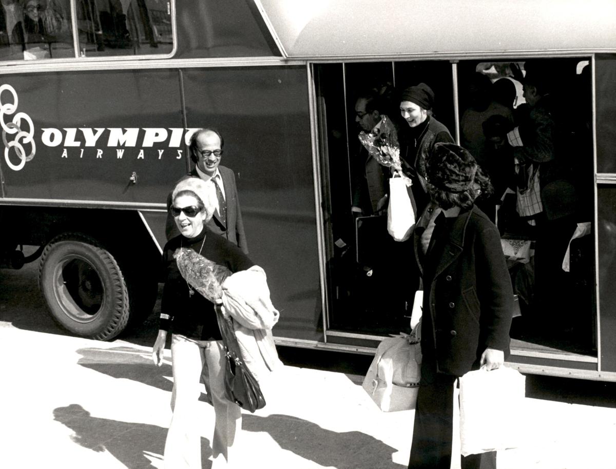 Υποδοχή του θιάσου στο αεροδρόμιο της Αθήνας. Μαίρη Αρώνη, Ελένη Ρήγα.