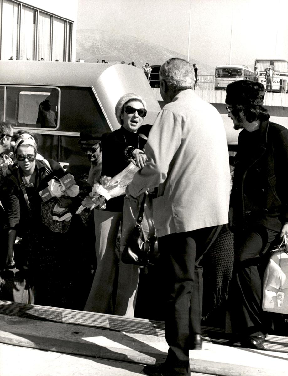 Υποδοχή του θιάσου στο αεροδρόμιο της Αθήνας. Μαίρη Αρώνη.