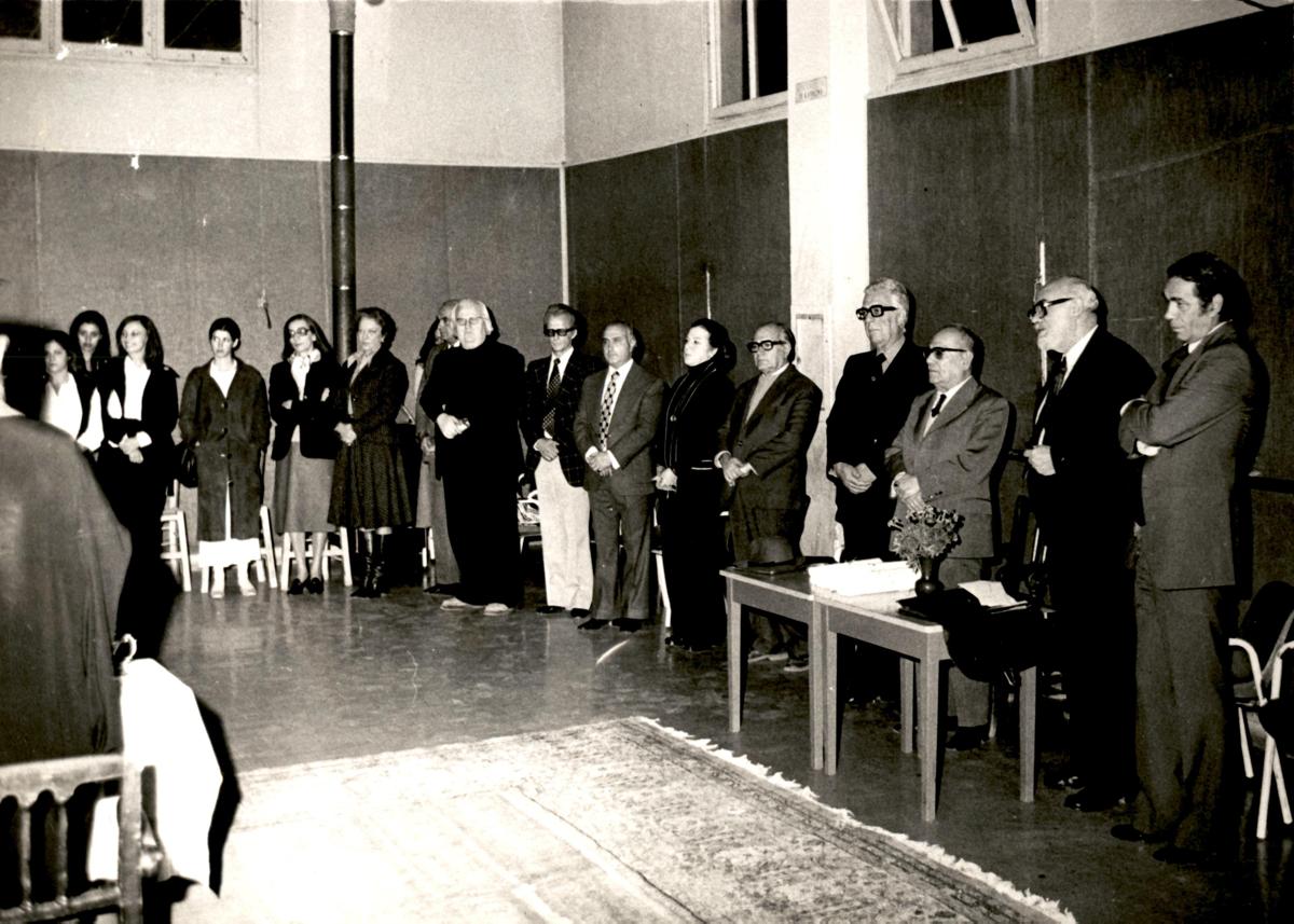 Στο βάθος: τέταρτη Ελεωνόρα Σταθοπούλου, Ελένη Χατζηαργύρη, Έλεν Τσουκαλά, Στέφανος Βασιελιάδης, Νίκος Παπακωνσταντίνου, Χριστόφορος Μπουμπούκης, Μαίρη Αρώνη. Δεξιά: Νίκος Καρύδης, Ι.Μ. Παναγιωτόπουλος. Πρώτος από δεξιά: Νίκος Τζόγιας Διευθυντής της Σχολής.