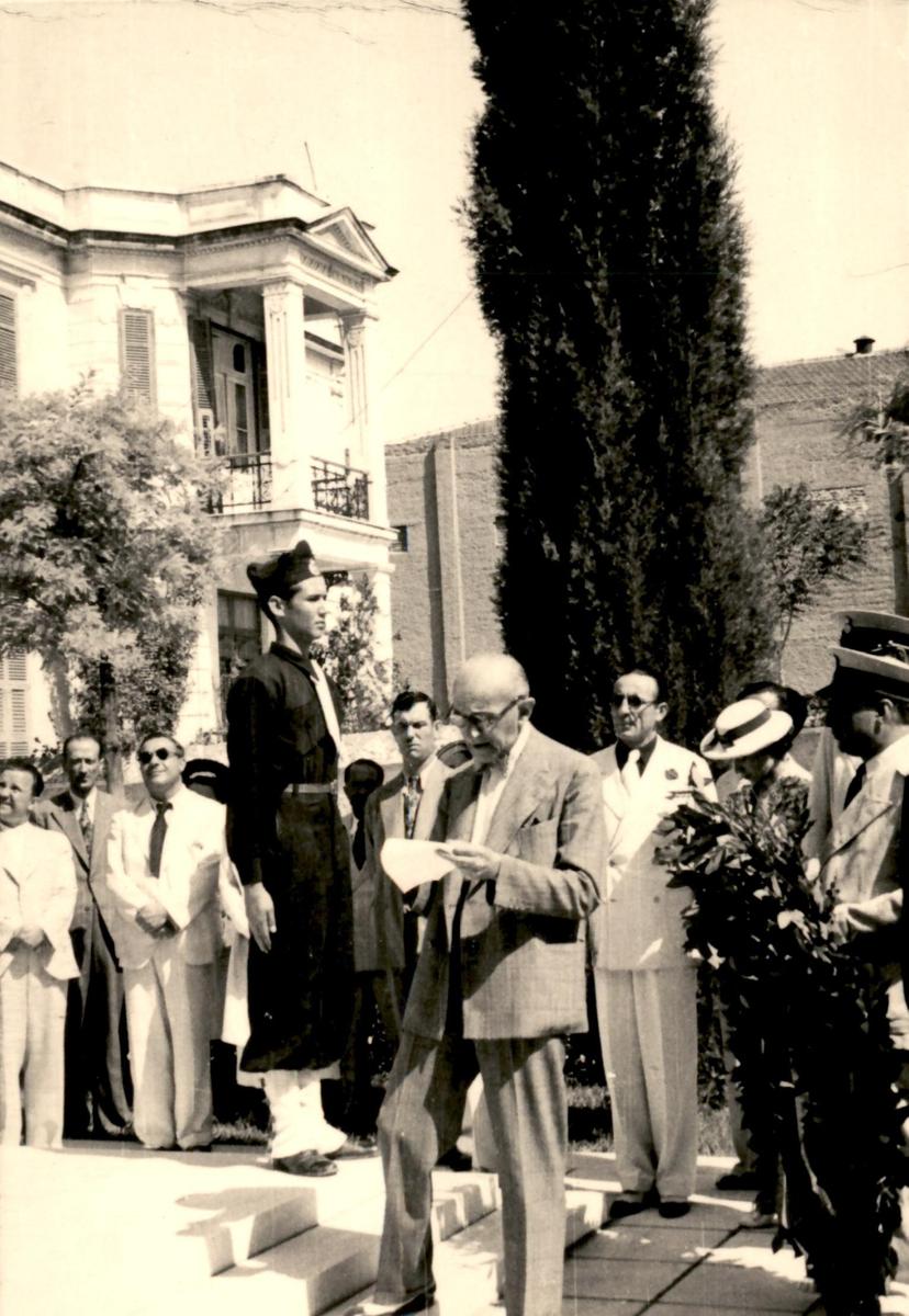 Περιοδεία του Εθνικού Θεάτρου στη Θεσσαλονίκη 1938, κατάθεση στεφάνου στο μνημείο του Γεωργίου Α'