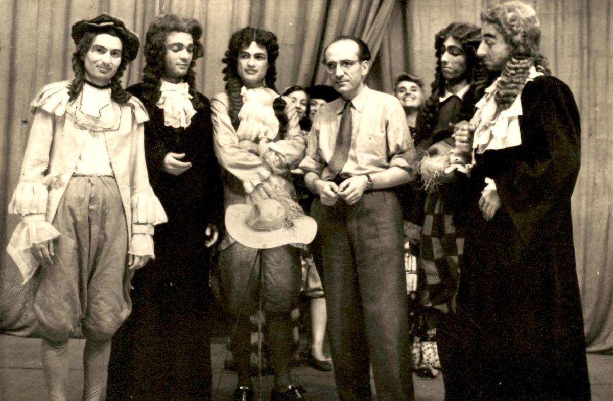 Στο κέντρο ο Σωκράτης Καραντινός και γύρω του σπουδαστές της σχολής με θεατρικά κοστούμια.
