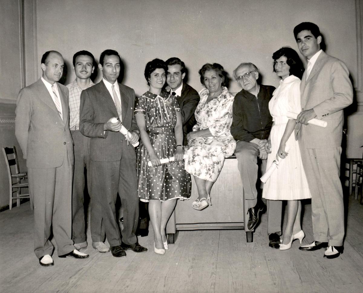 Στο κέντρο: Ελένη Χαλκούση, Σωκράτης Καραντινός Διευθυντής της Δραματικής Σχολής, Φωτεινή Μανέτα. Αριστερά τρίτος ο Τώνης Γιακωβάκης.