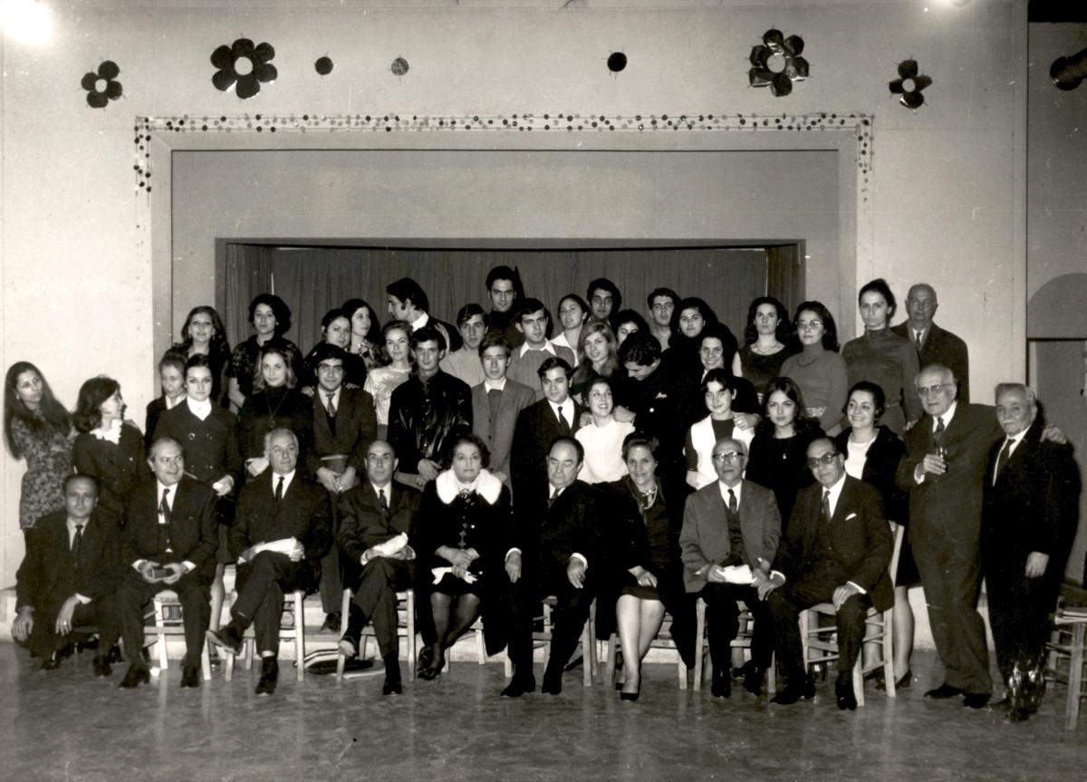 Μπροστά: Τάσος Αθανασιάδης (τέταρτος), Ελένη Χαλκούση, Ευάγγελος Φωτιάδης, Μιράντα Μυράτ, Γιάννης Σιδέρης. Δεξιά όρθιος: Σωκράτης Καραντινός Διευθυντής της Σχολής. Πίσω οι σπουδαστές της Σχολής, διακρίνονται στη δεύτερη σειρά: Δημήτρης Πιατάς, Χρήστος Βαλαβανίδης.