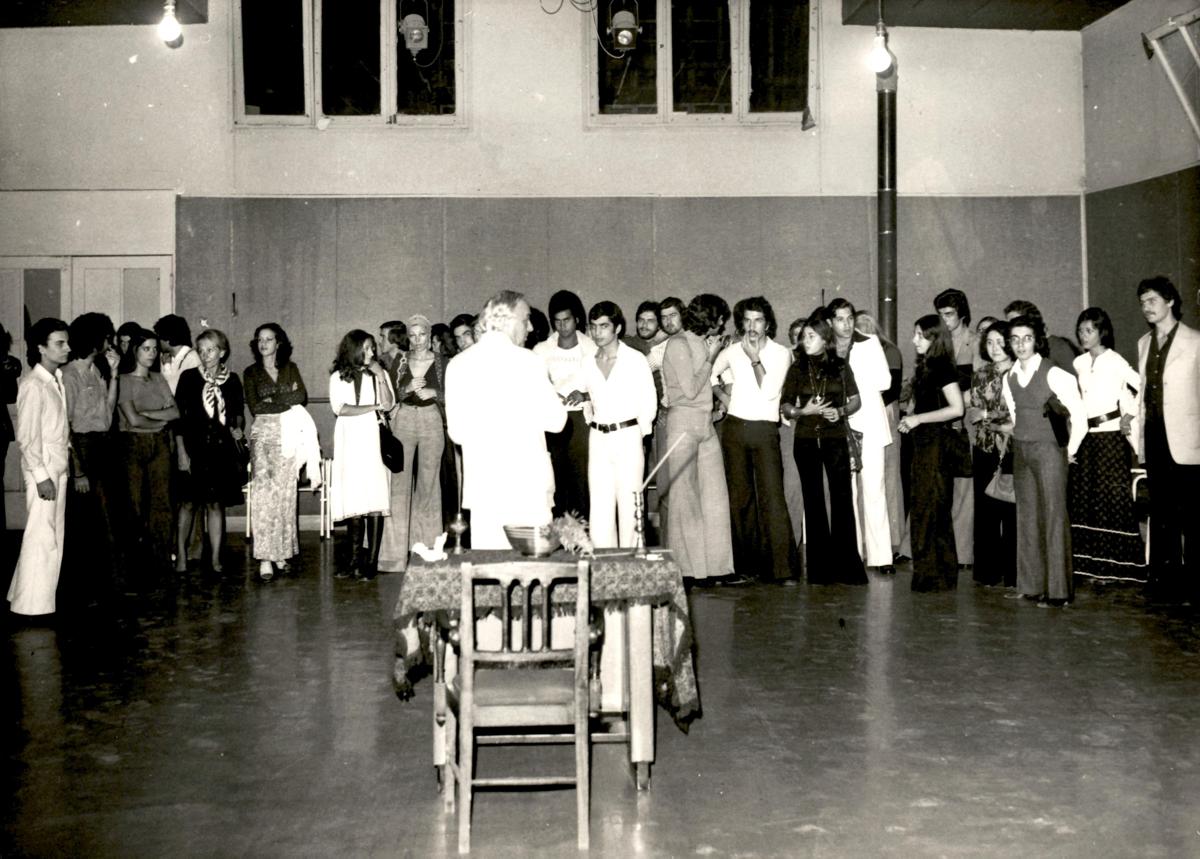 Οι σπουδαστές συγκεντρωμένοι στην αίθουσα της Σχολής. Δεξιά διακρίνονται: Λήδα Τασοπούλου, Μαρία Χορς, Τζένη Δριβάλα.