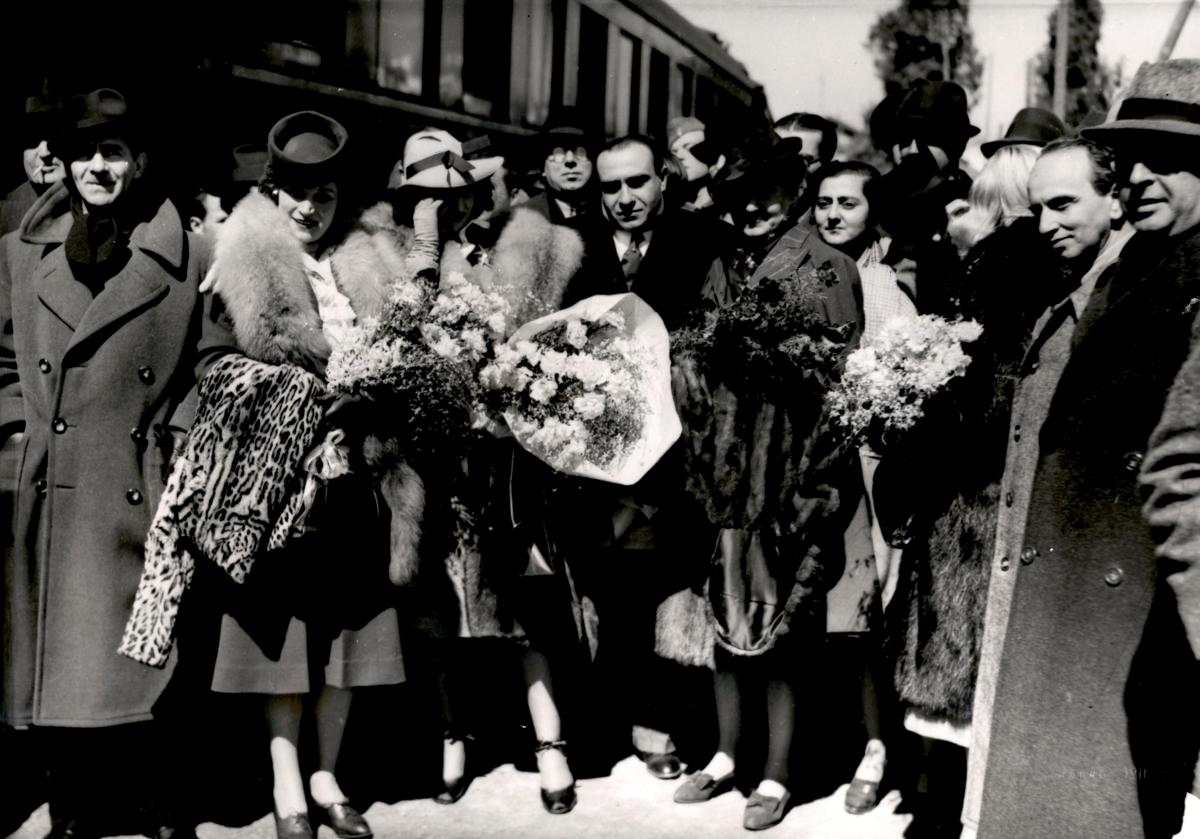 Στιγμιότυπο από την υποδοχή του θιάσου στο σιδηροδρομικό σταθμό. Στο κέντρο ο Κωστής Μπαστιάς. Δεξιά: Ρενάτο Μόρντο, Γεώργιος Λυκούδης.