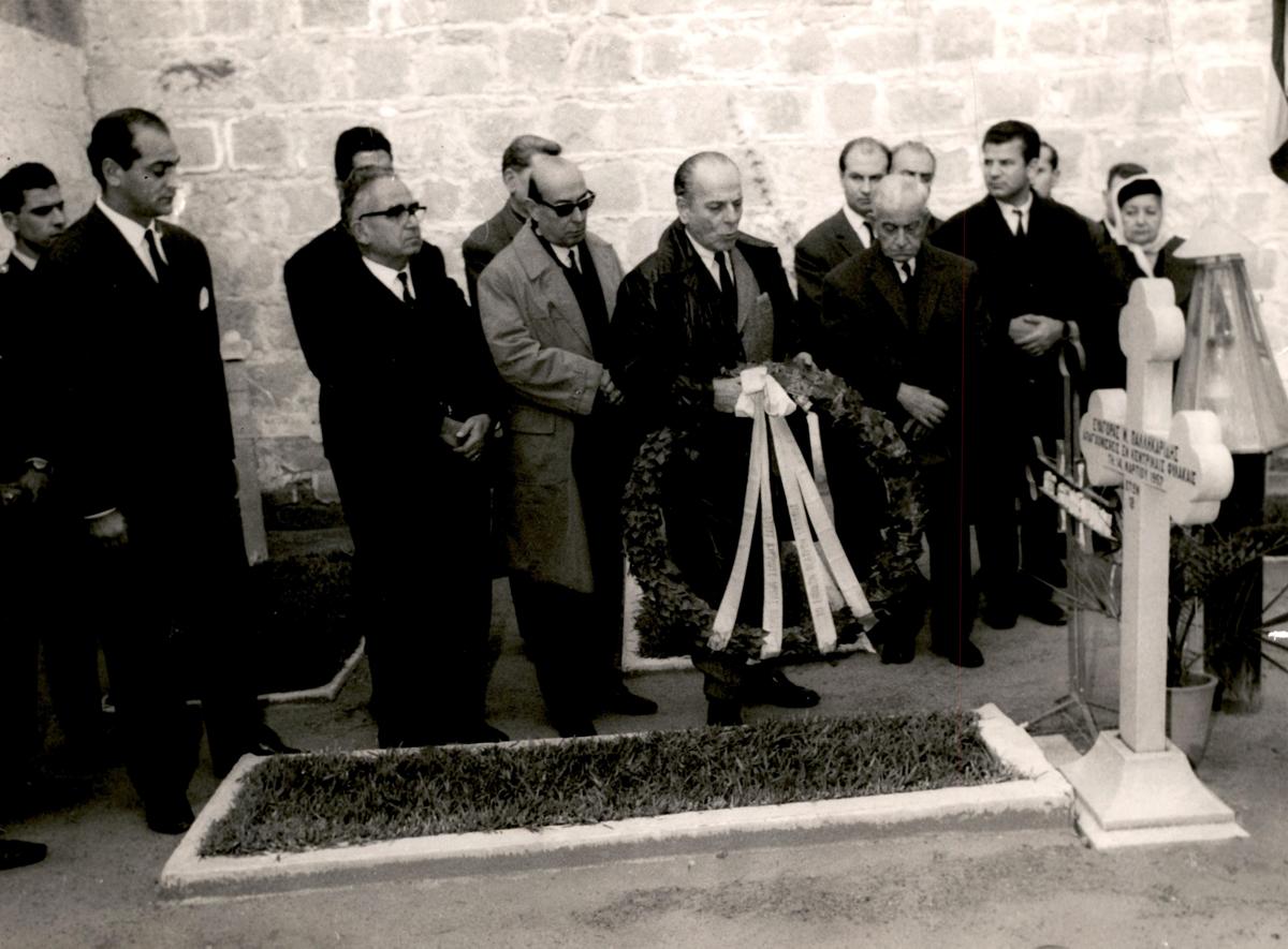 Στιγμιότυπο από την κατάθεση στεφάνου. Αριστερά: Θόδωρος Δημήτριεφ. Στο κέντρο: Τάσος Αθανασιάδης, Αλέξης Μινωτής, Χριστόφορος Νέζερ. Πίσω δεξιά: Κώστας Κοκκάκης, Θόδωρος Μορίδης, Γιώργος Γεωργίου.