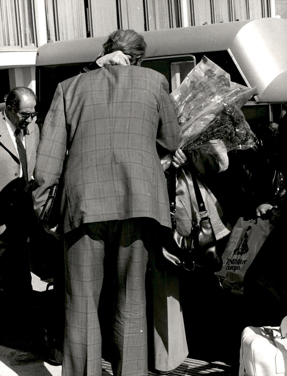 Στιγμιότυπο από τη  υποδοχή του θιάσου στο αεροδρόμιο. Ο Θόδωρος Κρίτας αγκαλιάζει τη Μαίρη Αρώνη.