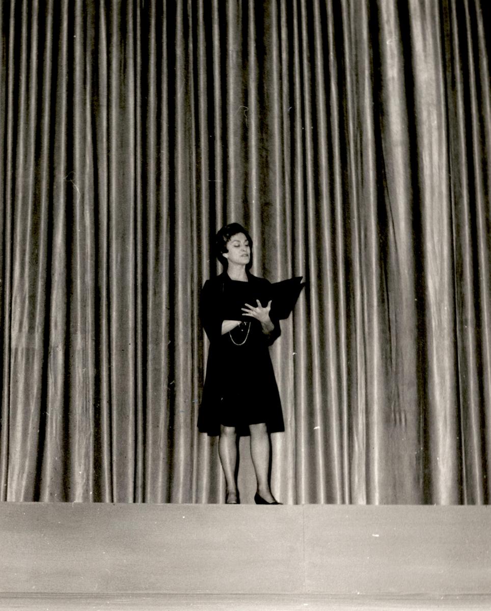Στιγμιότυπο από την εκδήλωση στην Αίθουσα της Κεντρικής Σκηνής. Πάνω στη σκηνή: Πίτσα Καπιτσινέα.