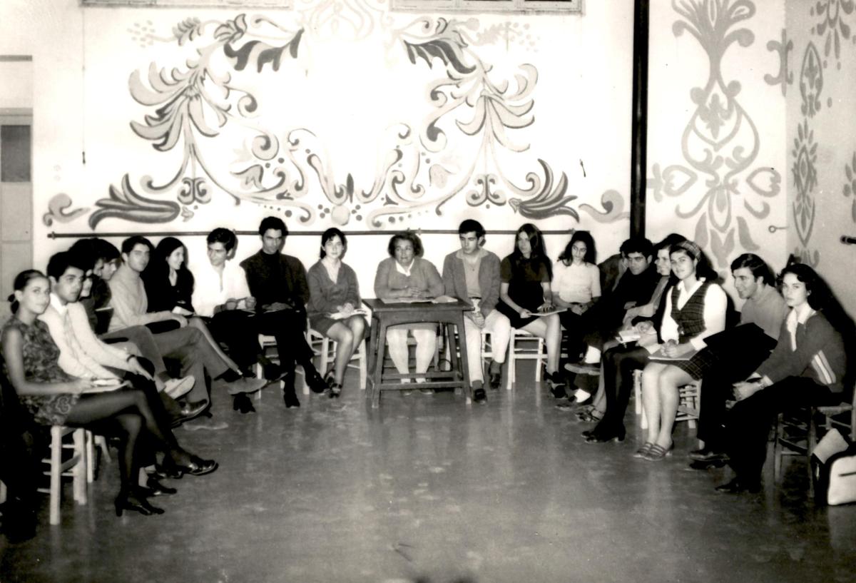 Στο κέντρο: Ελένη Χαλκούση, γύρω της μαθητές της Σχολής. Δεξιά μεταξύ άλλων: Δημήτρης Πιατάς.