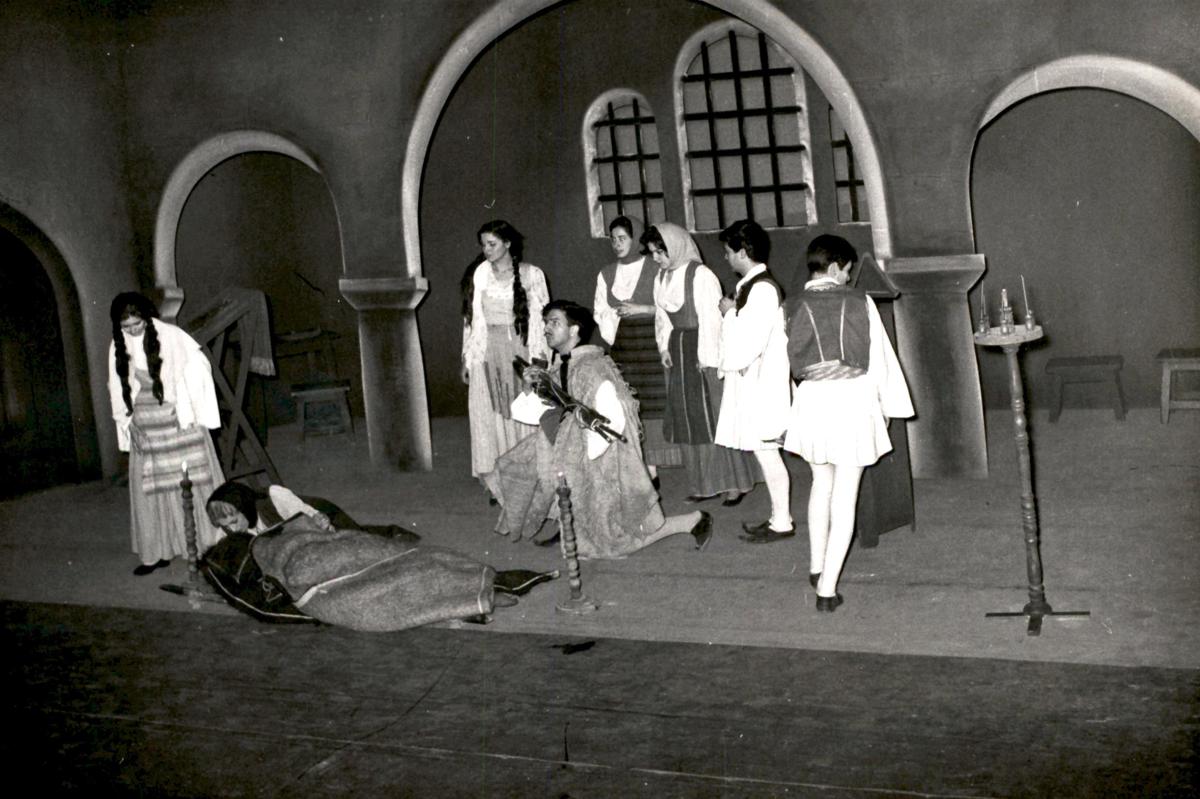 Στιγμιότυπο από την παράσταση. Στο κέντρο: Σπύρος Ευαγγελάτος, πίσω του δεξιά: Νίκη Τριανταφυλλίδη.