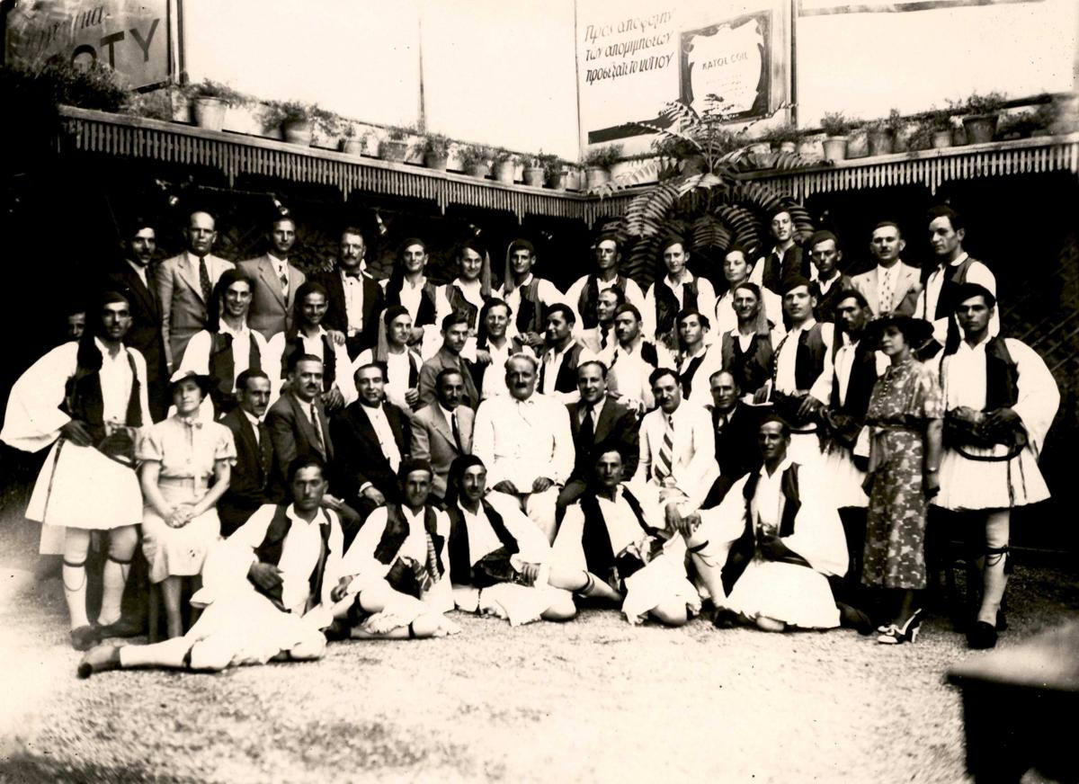 Στην πρώτη σειρά καθιστοί: Κωστής Μπαστιάς (τέταρτος), Κώστας Κοτζιάς (στο κέντρο). Γύρω τους άνδρες, ορισμένοι με παραδοσιακό ένδυμα, και γυναίκες ποζάρουν σε αναμνηστικό στιγμιότυπο.