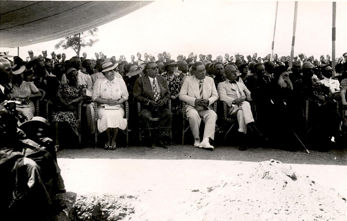 Στιγμιότυπο από την εκδήλωση. Διακρίνονται στο κέντρο ο Γενικός Διευθυντής Κωστής Μπαστιάς, Γεώργιος Κυρίμης; Διοικητής Μακεδονίας και ο Βρετανός πρέσβης Sidney Waterlow. Αριστερά δεύτερη: Λουκία Μεταξά-Μαντζούφα.