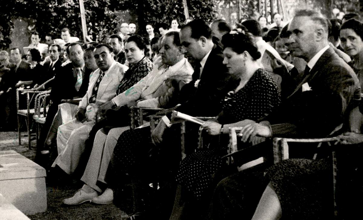 Στιγμιότυπο από επίσημη εκδήλωση στο θέατρο Ηλύσια. Στην πρώτη σειρά διακρίνονται: Κωστής Μπαστιάς Γενικός Διευθυντής, Γεώργιος Κυρίμης; Διοικητής Μακεδονίας.