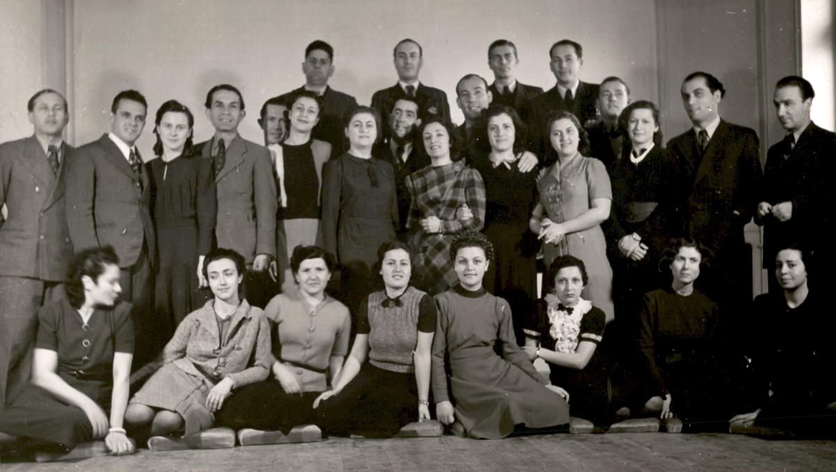 Μέλη της Χορωδίας της Λυρικής Σκηνής σε αναμνηστικό στιγμιότυπο. Κάτω στο κέντρο διακρίνεται η Ανθή Ζαχαράτου.