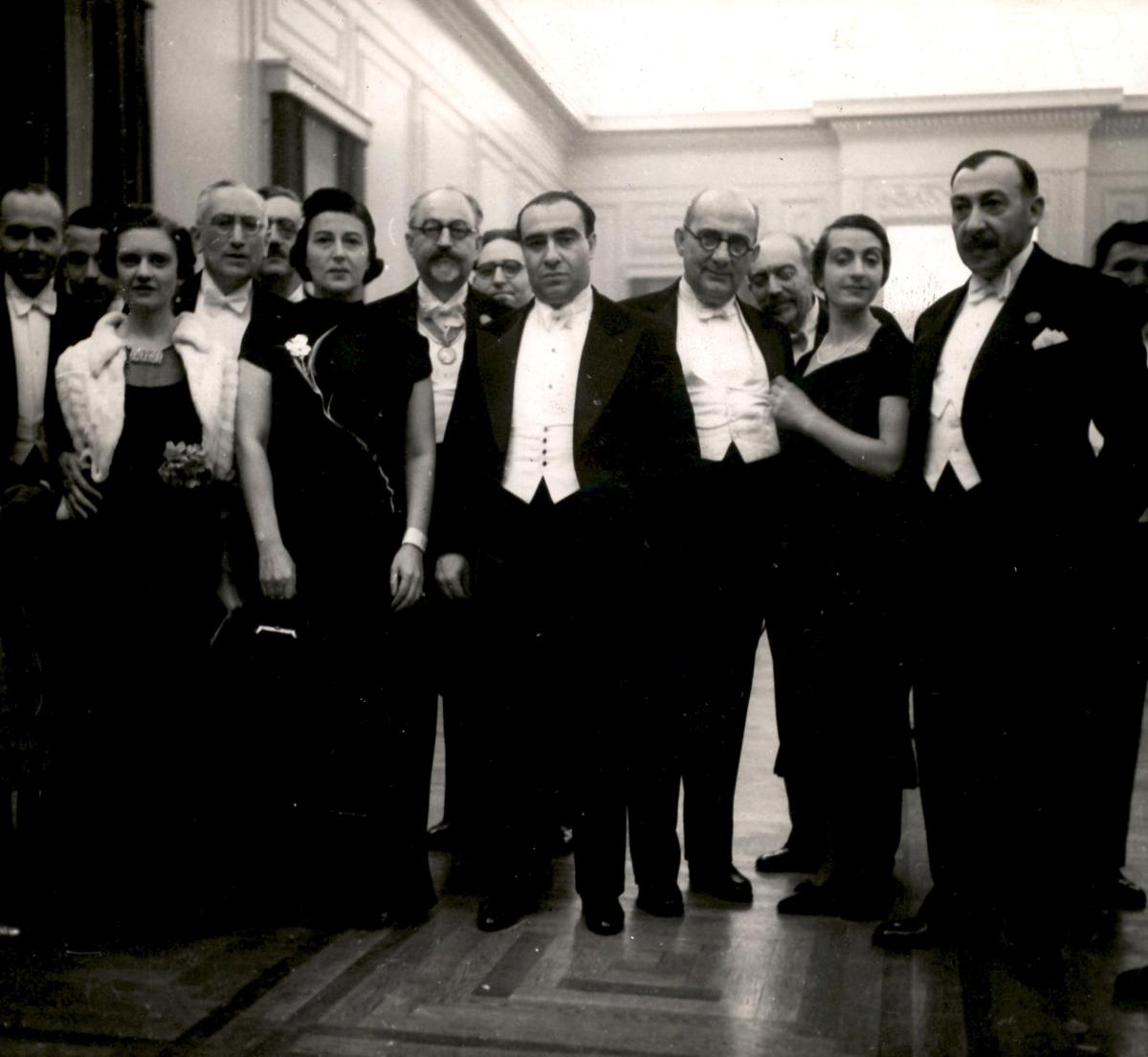 Στιγμιότυπο από την εκδήλωση στη φουαγιές του Εθνικού Θεάτρου. Μπροστά στο κέντρο: Κατίνα Παξινού, Γεώργιος Οικονόμος, Δωστής Μπαστιάς. Δεξιά: Ελένη Παπαδάκη, Γεώργιος Ν. Βέλτσος.