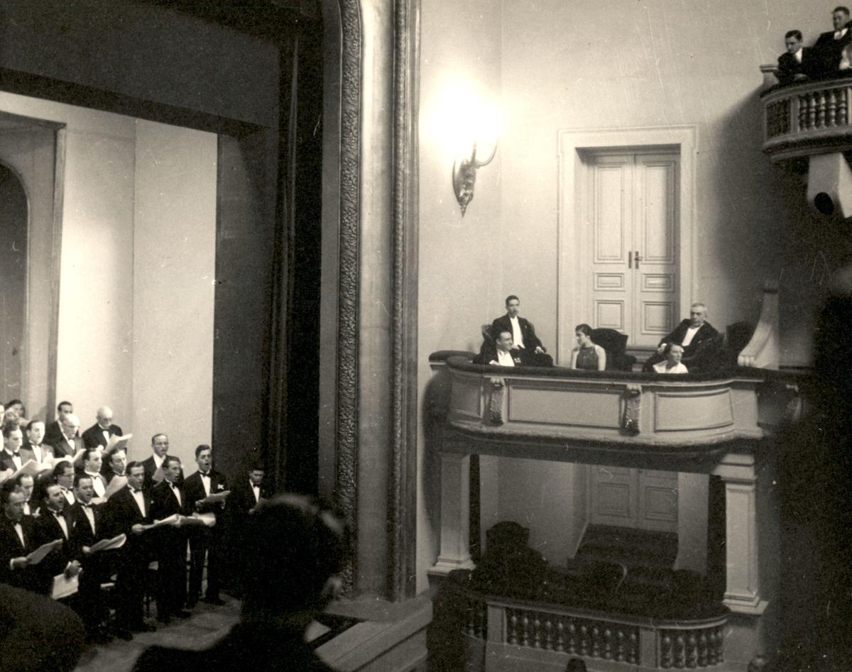 Στο θεωρείο διακρίνονται: Κωστής Μπαστιάς, Γεώργιος Μαντζούφας, Έφη Φερεντίνου, Ιωάννης Χαλκοκονδύλης. Στη σκηνή του θεάτρου: χορωδία.