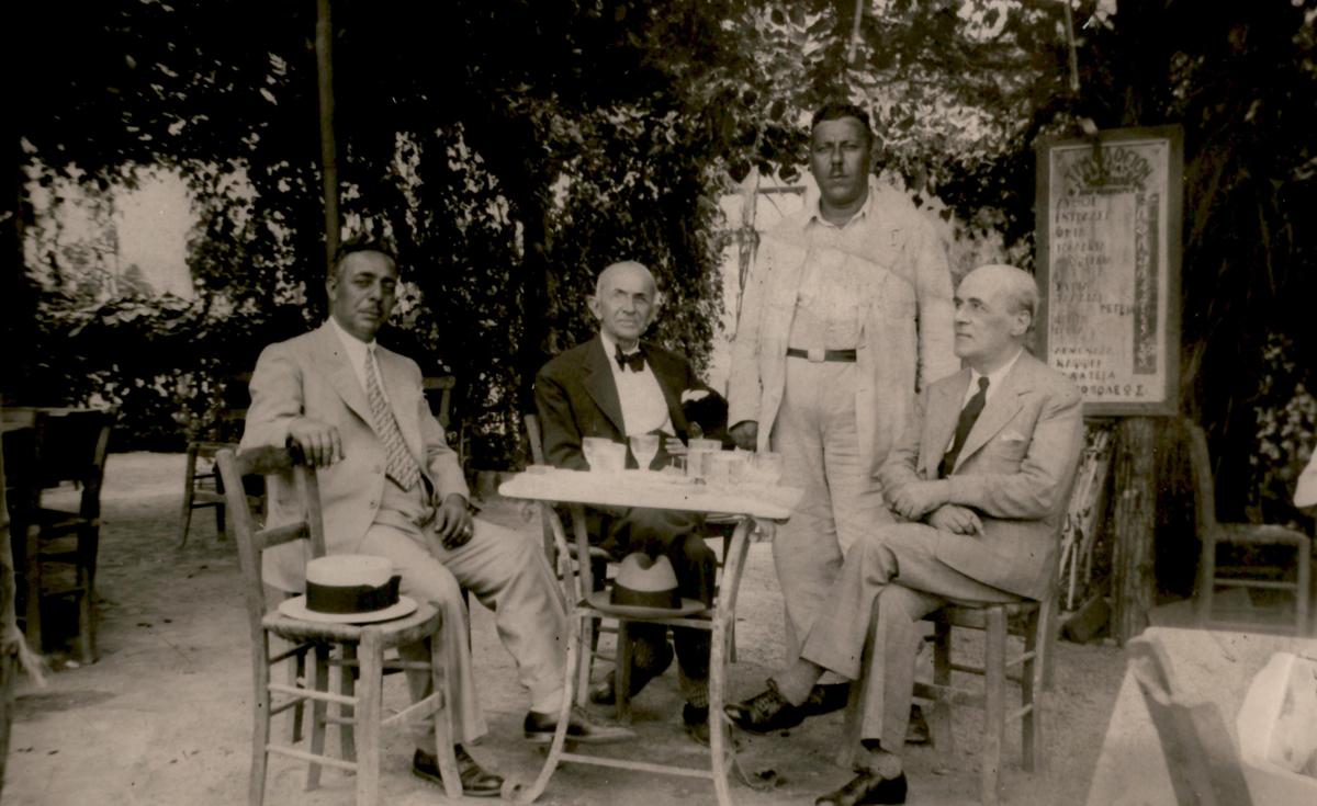 Ο Μιλιτιάδης Λιδωρίκης (δεύτερος) και ο Νίκος Παπαγεωργίου (τέταρτος) σε καφενείο.