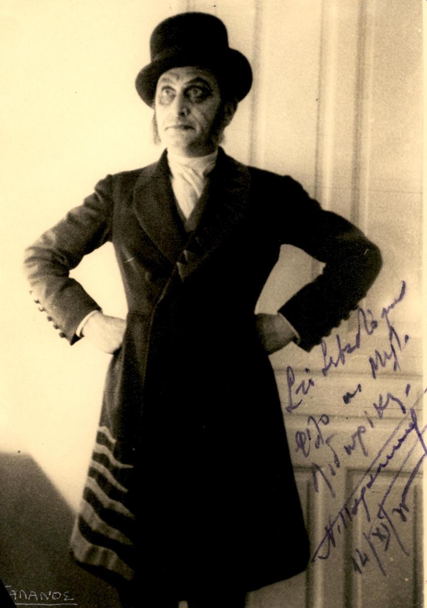 Φωτογραφικό πορτρέτο με θεατρικό κοστούμι. Φέρει την αφιέρωση «Στον σεβαστό μου φίλο κ. Μίλτο Λιδωρίκη. Ν. Παρασκευάς. 14/11/35».