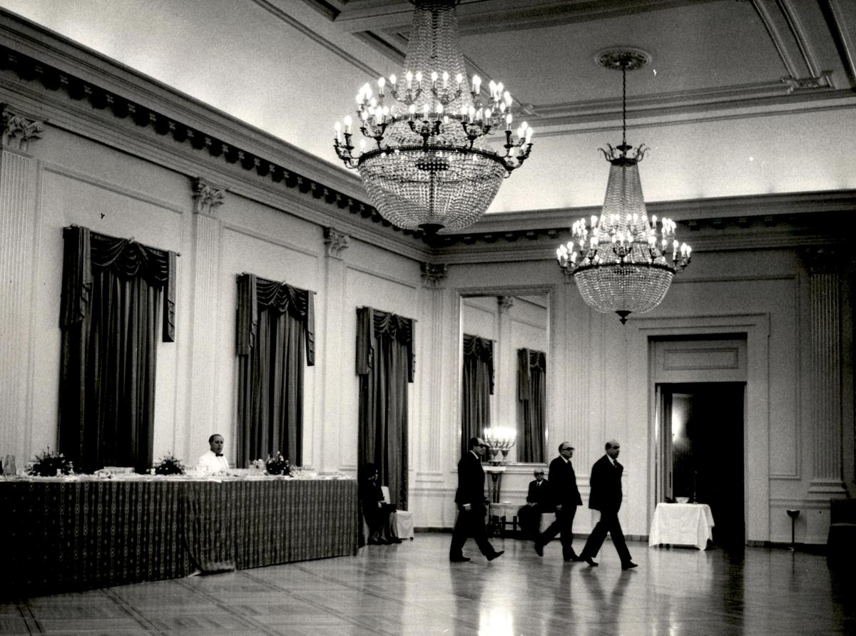 Προετοιμασία εκδήλωσης στην Αίθουσα Χορού. Διακρίνονται: Αλ. Θωμόπουλος (πρώτος), Τάσος Αθανασιάδης (τρίτος).