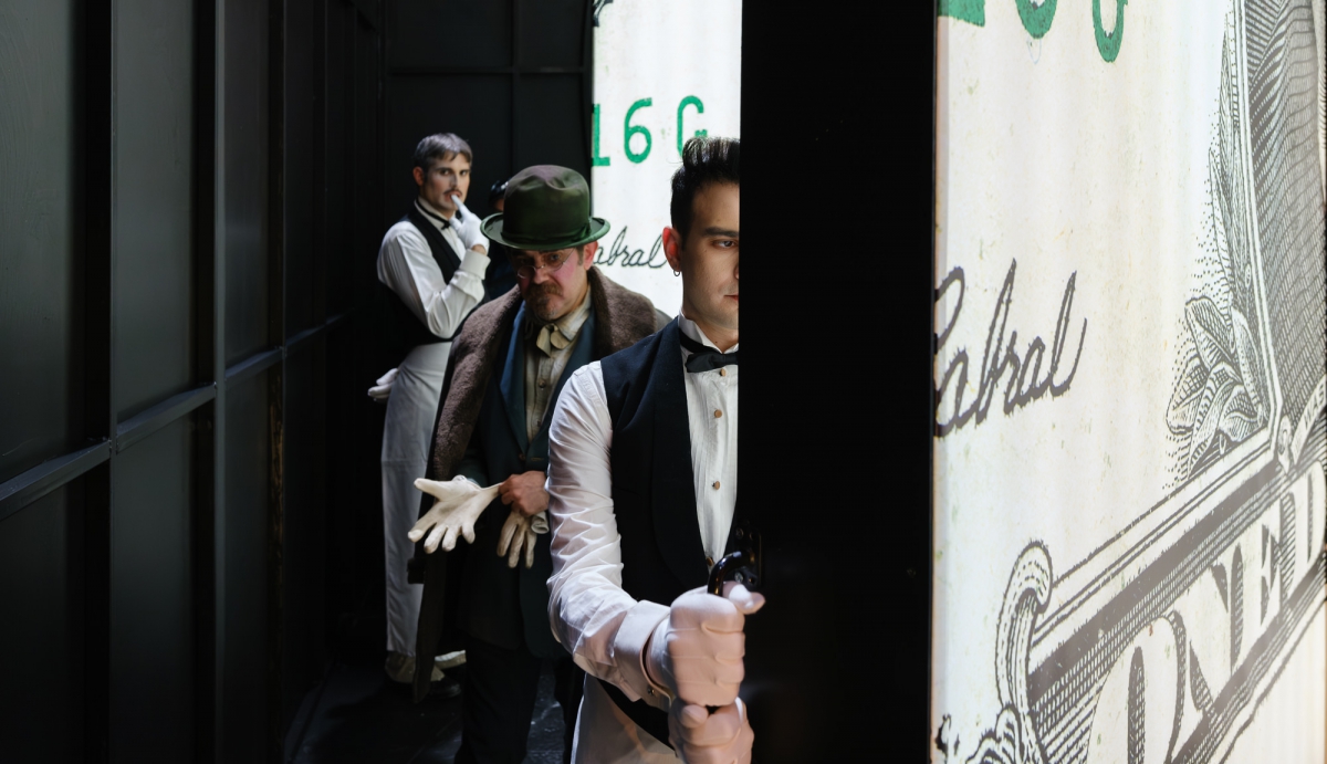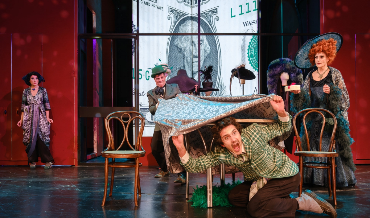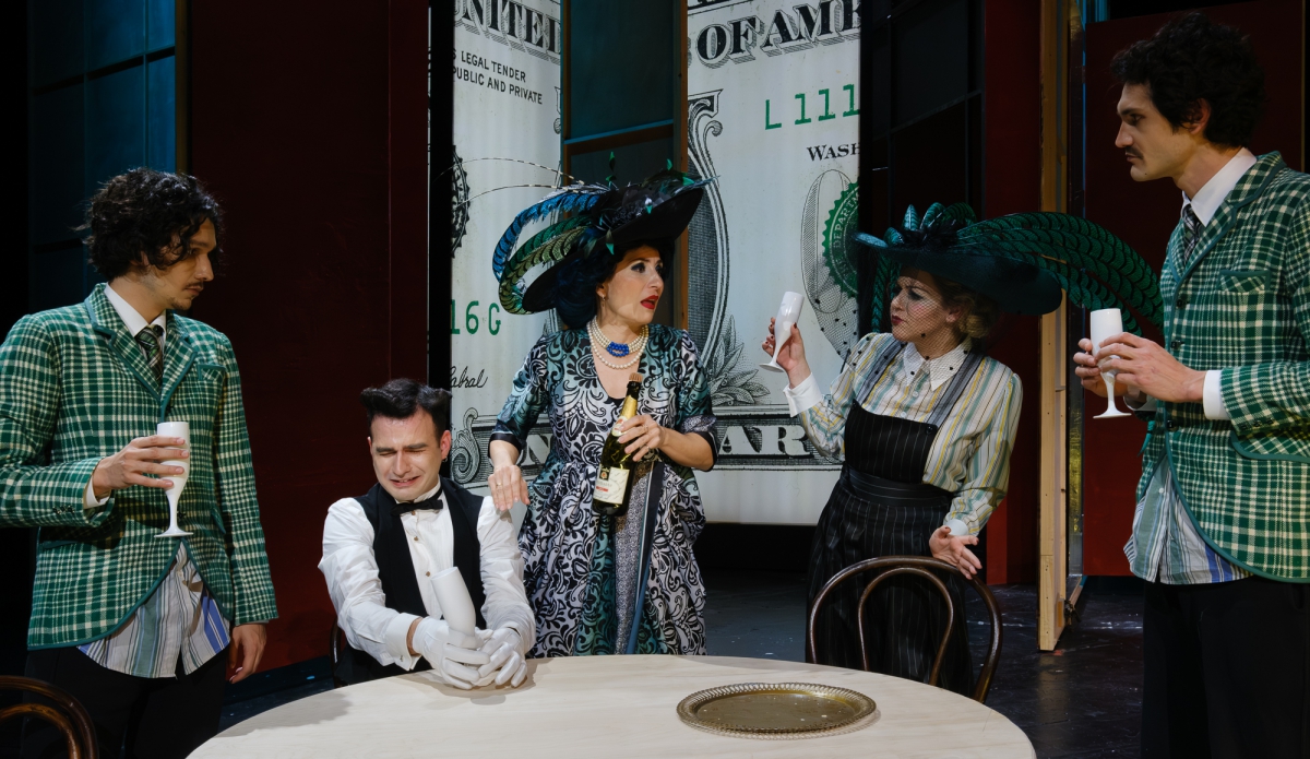 Ευδοκία Ρουμελιώτη (Αϊρήν Μολλόυ), Σίμος Κακάλας (Οράτιος Βαντεργκέντλερ), Γαλήνη Χατζηπασχάλη (Ντόλλυ Γκάλλαχερ Ληβάι) (πίσω)Φώτης Στρατηγός (Βαρνάβας Τάκερ)